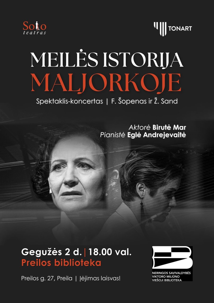Gegužės 2-ąją (šeštadienį) kviečiame Jus į jaukų vakarą Preilos bibliotekoje. Čia Jūsų lauks spektaklis-koncertas „Meilės istorija Maljorkoje“ – jautri ir gyva patirtis, kurioje susipina garsas, žodis ir scena.